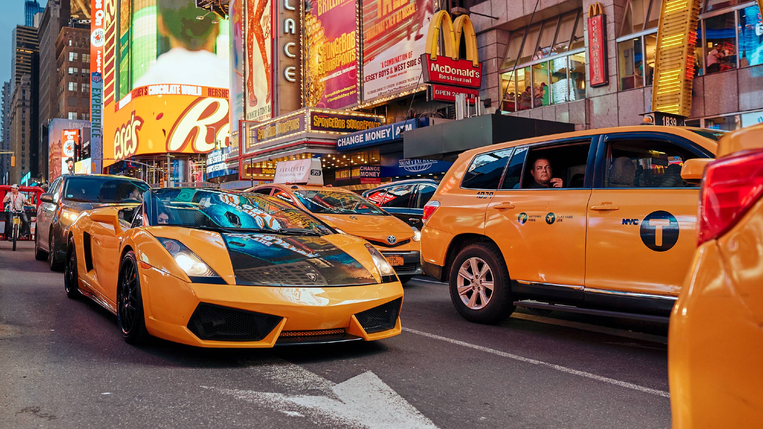 Initially I was attracted by the yellow Lamborghini passing the cabs. The whole scene filled with an orange glow. Noticing the cab passenger was just icing on the cake.